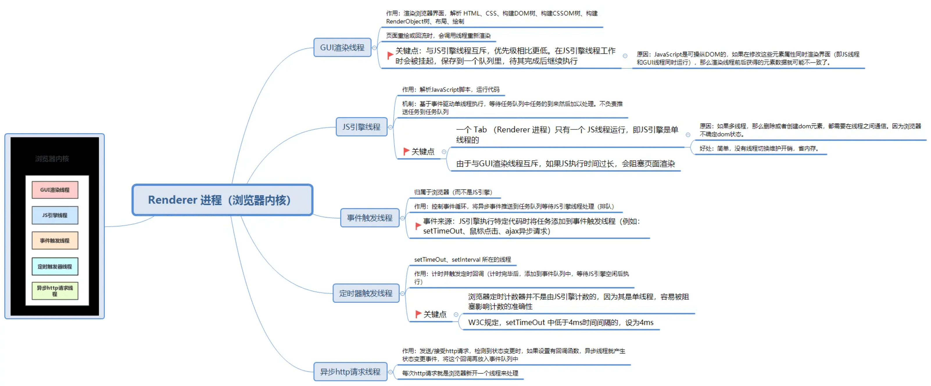 一个 tab 渲染进程只有一个 JS 线程运行,即 JS 引擎是单线程的。
